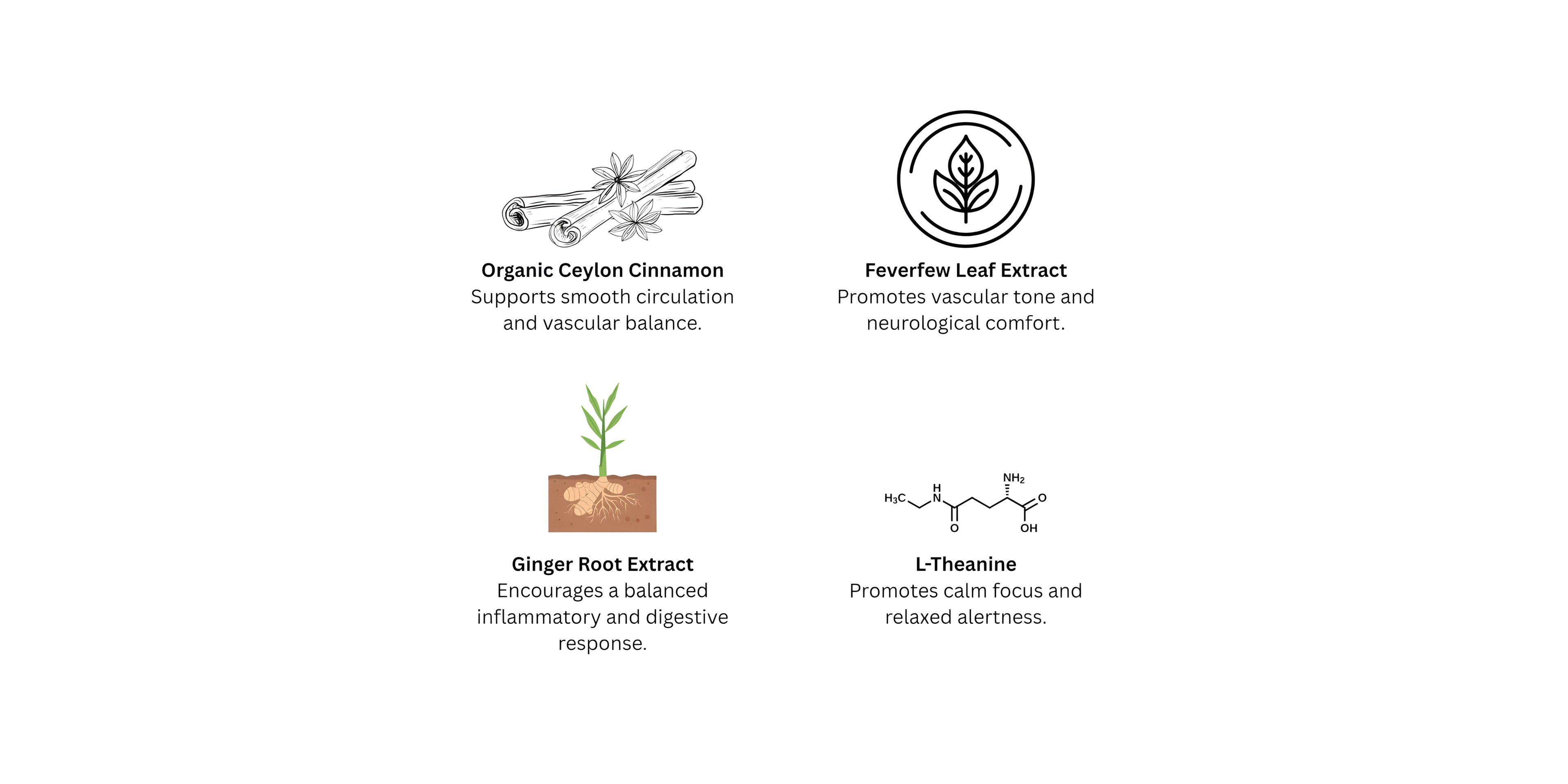 Our unique blend of Organic Ceylon Cinnamon, Feverfew, Ginger Root, L-Theanine, MCT Oil, Coenzyme Q10 (CoQ10), and L-Leucine work synergistically to promote calm, cellular energy, and smooth vascular circulation.