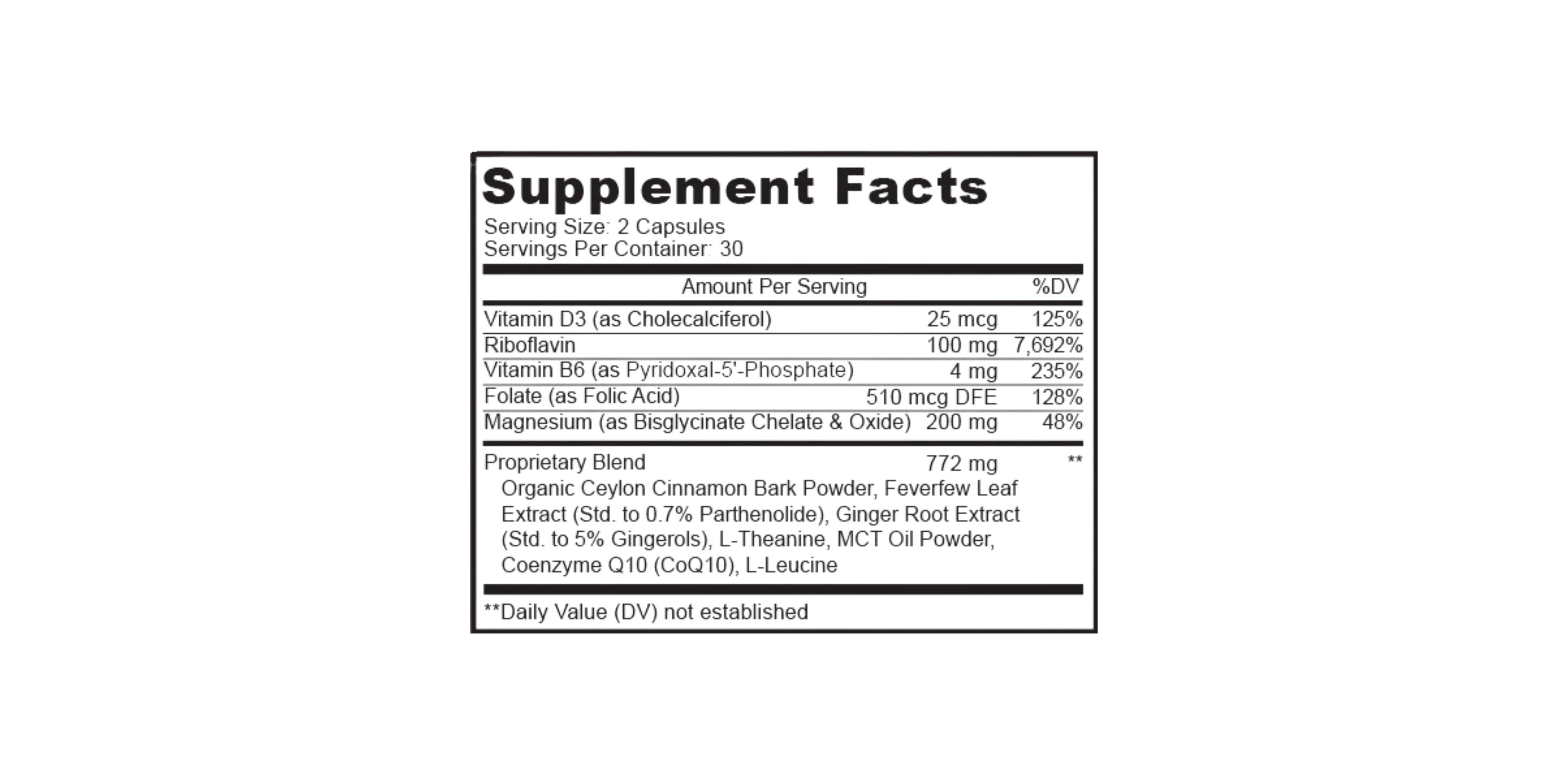 Organic Ceylon Cinnamon, Feverfew, Ginger Root, L-Theanine, MCT Oil, Coenzyme Q10 (CoQ10), and L-Leucine — a synergistic combination designed to promote calm focus, vascular harmony, and cellular vitality.