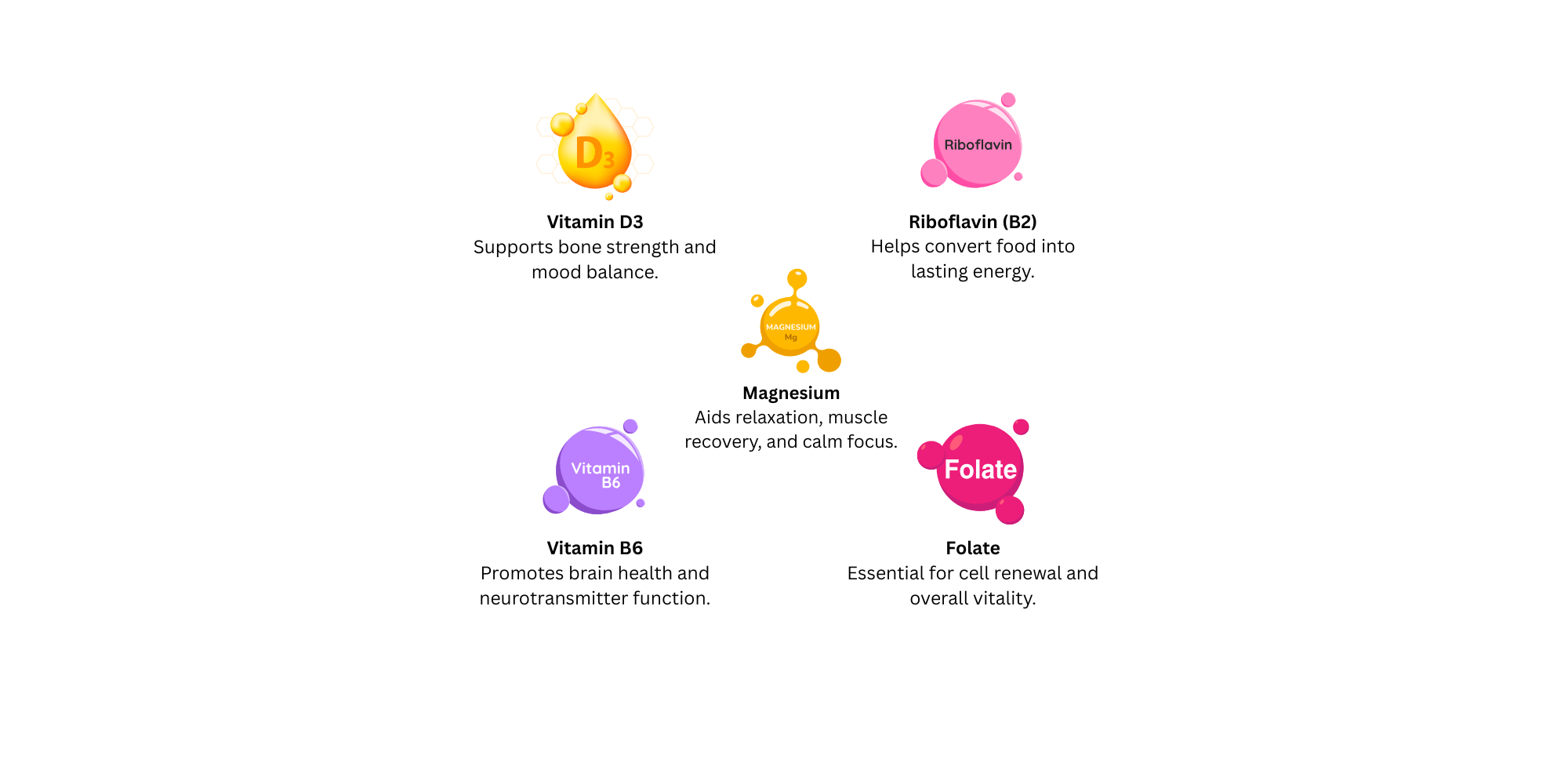 Main Ingredients: Vitamin D3, Riboflavin (B2), Vitamin B6, Folate, and Magnesium — known for their role in energy metabolism and nervous system support.